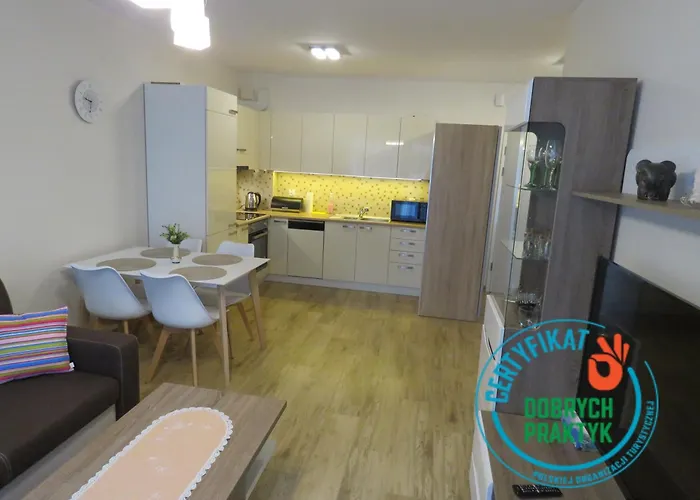 Також до послуг гостей обладнана кухня з мікрохвильовою піччю, електрочайником і холодильником. Для зручності гостей передбачено таке кухонне обладнання, як кавоварка. Гості можуть скуштувати європейської кухні закуски та страви у ресторані Restauracja Shuum, розташованому всього лише за 7 хвилин пішої прогулянки. Аеропорт "Щецин-Голенюв" імені Солідарності розташований за 95, а автовокзал Fredry - за 250 метрів від помешкання. Ідеальний відпочинок включає доступ до аквапарку, веранди для засмаги і внутрішнього двору, що дозволяє гостям відчути вершину релаксації. Доступ до піших прогулянок, їзди на велосипеді і риболовлі допомагає гостям залишатися активними під час подорожі.